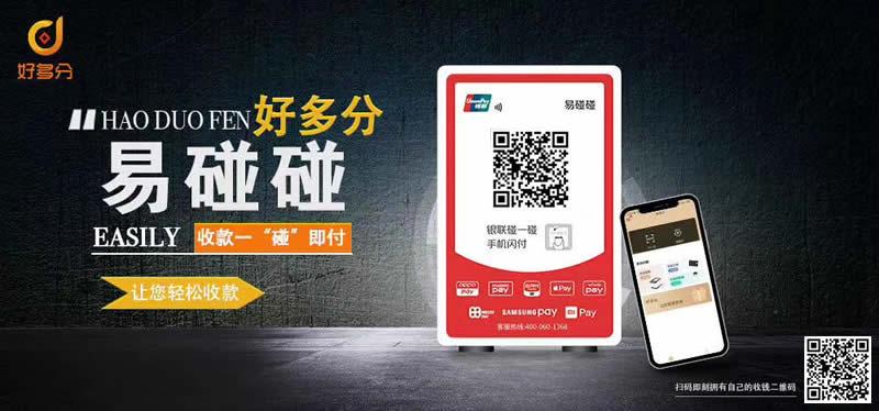 (好多分)易碰碰聚合支付二维码是易票联支付公司推出的一款聚合支付收款码。并且内置NFC芯片,支持手机pya支付。