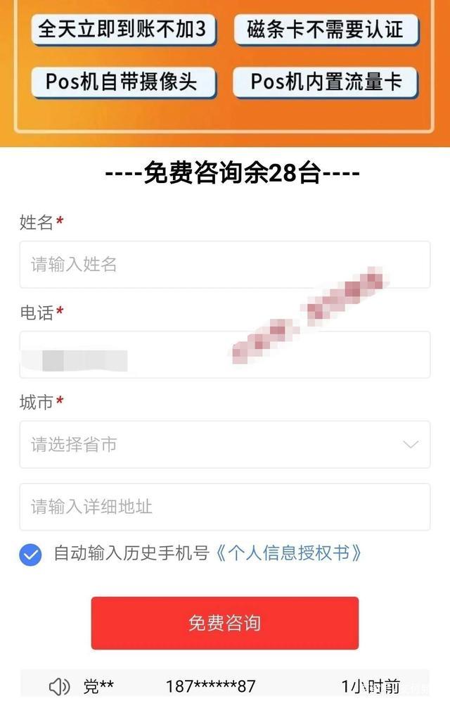 所以,投放了广告,再进行精准推送,然后有需求的人就会在表单上留下自己的地址与联系方式,这样,你就能收到一个广告上面展示的POS机了。