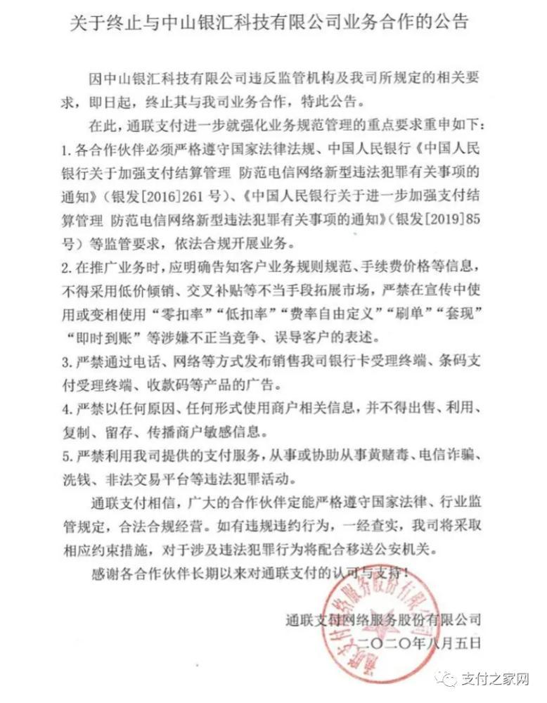 上周,通联支付发布《关于终止和中山银汇科技有限公司业务合作的公告》。