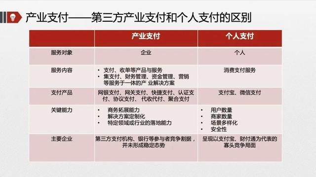 随着个人支付市场垄断格局已经形成,转向产业端寻求新的增量市场成为其他支付机 构的关键突破点。