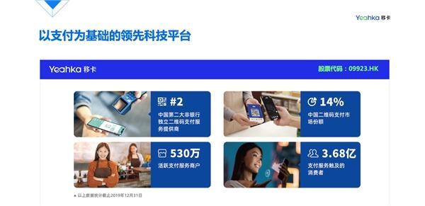 移卡是中国第二大二维码支付的服务提供商,截止2019年12月31日,占二维码支付市场份额的14%。现在,移卡有530万的活跃支付商户,可以触达3.68亿消费者。