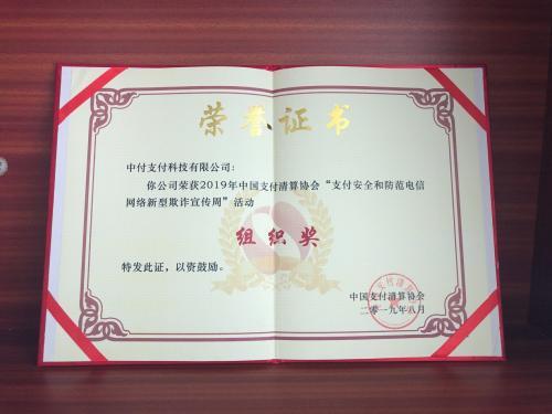 2019年中付支付作为中国支付清算协会会员单位,积极参与“支付安全和防范电信网络新型欺诈宣传周”活动。“支付安全和防范电信网络新型欺诈宣传周”是中国支付清算协会为了宣传支付安全知识,增强民众防诈反诈意识举办的活动。为扩大宣传声势,增强参与感,协会同时面向会员单位组织了宣传图片和文案征集活动。中付支付荣获“组织奖”。