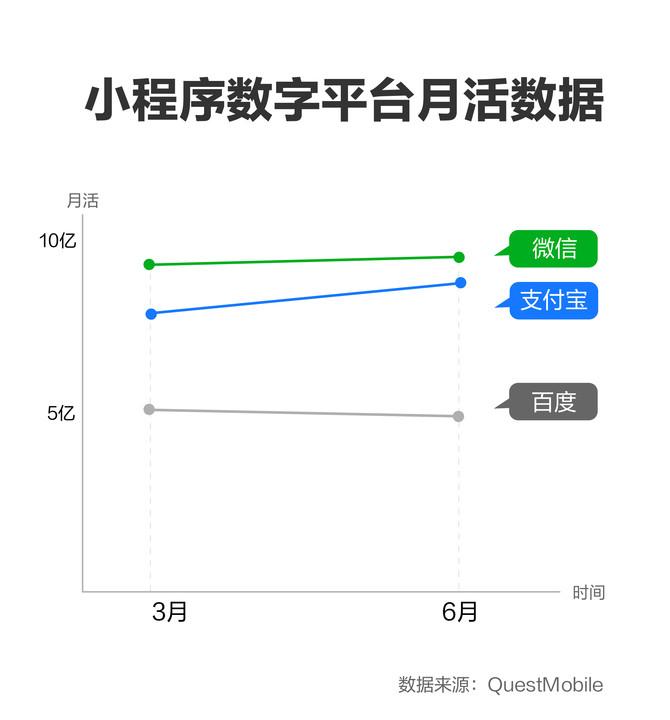 小程序助力各行业各业数字化还在风口期。8月14日消息,据第三方数据研究机构QuestMobile近期公布的数据,今年3月到6月,支付宝月活跃用户数(MAU)增势显著,增加了2700万。另外两大小程序平台中,微信月活跃用户数微增800万,此外,手机百度月活跃用户数下降700万。