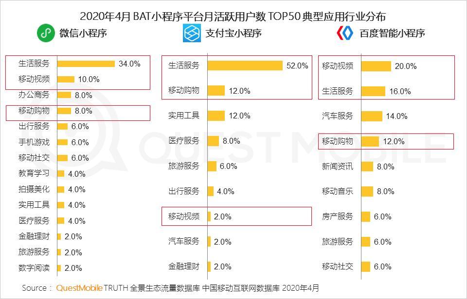 除了月活数增加,支付宝也成为国内“生活服务”占比最高的数字平台。此前,QuestMobile发布分行业数据,在平台用户数Top50的应用中,生活服务类应用支付宝占比最高,为52%;其次是微信的34%,百度则为16%。