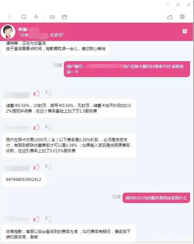 咨询中付总部客服,问及这0.015%的服务费具体是指什么,客服给出的回复是需要咨询服务商。