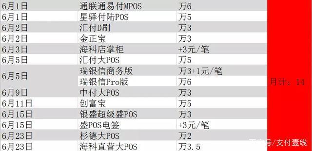6月共有10家支付公司的14款POS机涨价。