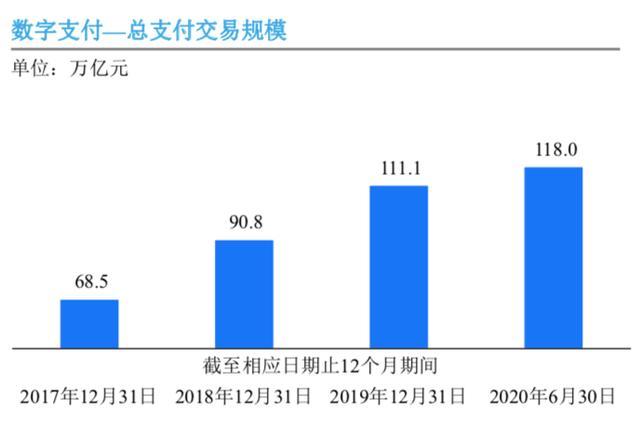 作为中国最大的数字支付服务商,蚂蚁最核心业务的数字支付业务通过蚂蚁旗下的支付宝平台完成。招股书显示,在截至2020年6月30日止12个月期间,公司的境内用户在平台上完成了共计118万亿元的总支付交易规模。
