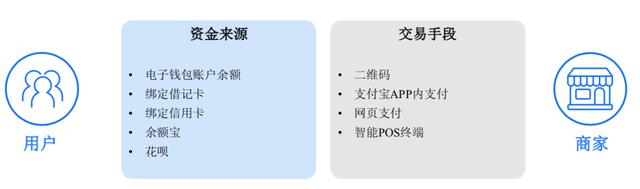 数字支付交易方式:对于绝大部分支付场景,用户可从电子钱包账户余额、借记卡和信用卡账户、余额宝及花呗这五类资金来源中任选一种,主要可以通过二维码等四种便捷的方式收款。