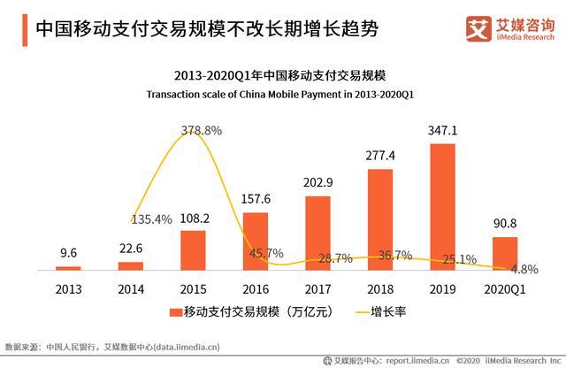 数据显示,受疫情影响,2020年第一季度中国移动支付交易规模为90.8万亿元,同比增速4.8%,增速下滑明显。艾媒咨询分析师认为,长期来看,疫情加速了消费服务线上化,驱动移动支付场景的拓展以及用户移动支付习惯的强化。未来移动支付交易规模将在用户规模以及支付频率上升的驱动下持续增长。