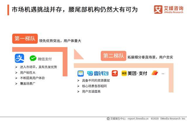 支付宝和微信进入市场早,借助各自平台优势抢占了大量用户,之后又通过拓展线下场景,占据了大量市场份额。艾媒咨询分析师认为,中国移动支付市场空间广阔,随着移动支付场景多元化、垂直化发展,腰尾部支付机构在细分领域仍然大有可为。