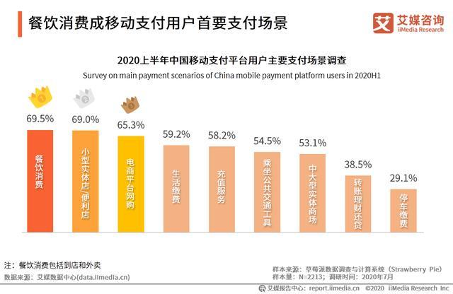 iiMedia Research(艾媒咨询)数据显示,受访用户最常使用移动支付平台的三个场景分别为餐饮消费、小型实体店/便利店消费和电商平台网购,占比分别为69.5%、69.0%、65.3%。艾媒咨询分析师认为,布局高频刚需消费场景,有利于移动支付机构抢占用户心智,增加用户粘性,进而扩大市场份额。