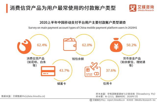 iiMedia Research(艾媒咨询)数据显示,受访用户对移动支付平台各类支付账户产品整体依赖度高于银行账户产品,其中消费信贷产品为受访用户最常支付的账户类型,占比达62.4%,其次是电子钱包余额,占比为62.0%。艾媒咨询分析师认为,用户对移动支付账户的高度依赖有利于移动支付平台拓展个人支付增值业务,提高平台变现能力。