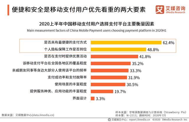 iiMedia Research(艾媒咨询)数据显示,受访用户在选择各类移动支付平台时,优先考虑支付便捷性和个人信息安全性,占比分别为62.4%、48.8%。艾媒咨询分析师认为,移动支付方式能够快速广泛渗透的原因在于便捷性,随着用户对移动支付工具依赖程度加大,支付的金额以及频率都将大幅提升,平台安全保障性也将备受重视。