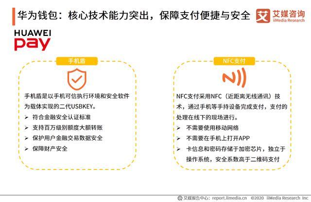 艾媒咨询分析师认为,通过NFC近场通信技术,华为钱包实现芯片级、金融级安全防护,依托SSE安全服务引擎,以及生物识别模块和可信执行环境,助力华为钱包的全场景移动金融服务及泛支付、泛安全服务。同时还为用户提供手机盾功能,让用户能够更安心地使用华为钱包的各项便捷功能。
