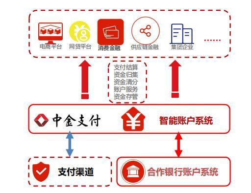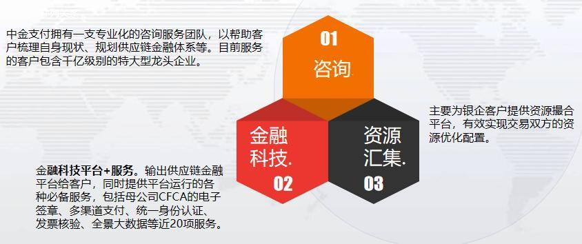 第一是产业链综合支付:以中金支付的智能账户产品为依托,充分发挥互联网优势,整合在线开户、身份认证、统一收款、账户资金管理、电子回单、交易查询与对账、在线理财等服务和功能,提高企业资金管理效率、降低财务成本、提高资金收益。