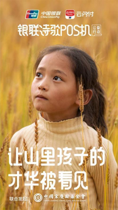 中国银联诗歌POS机公益行动从2019年7月正式启动,当年所募善款已陆续投入到安徽怀远、河南南阳、四川绵阳、新疆喀什、云南南华地区,帮助3140名家庭困难儿童接受艺术教育。2020年,云闪付APP用户数突破3亿,银联再度启动“银联诗歌POS机”公益行动,积极践行社会责任,助力高质量打赢脱贫攻坚战及精神扶贫,促进全社会对欠发达地区的少年儿童的关注,帮助他们接受更优质的教育。