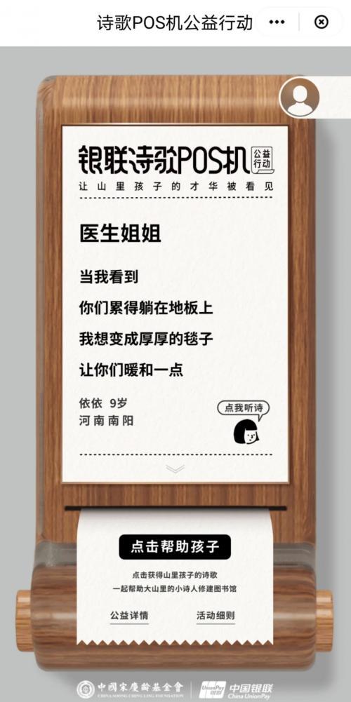 活动当天,云闪付APP“银联诗歌POS机”小程序正式上线。用户在云闪付APP中进入小程序,按下“点击帮助孩子”按钮,即可阅读、转发孩子的诗歌,还可以收到公益图书馆及艺术素养课程的最新进展。香港和澳门地区用户也可在港澳版云闪付APP中参与公益,倾听山区孩子的心声。