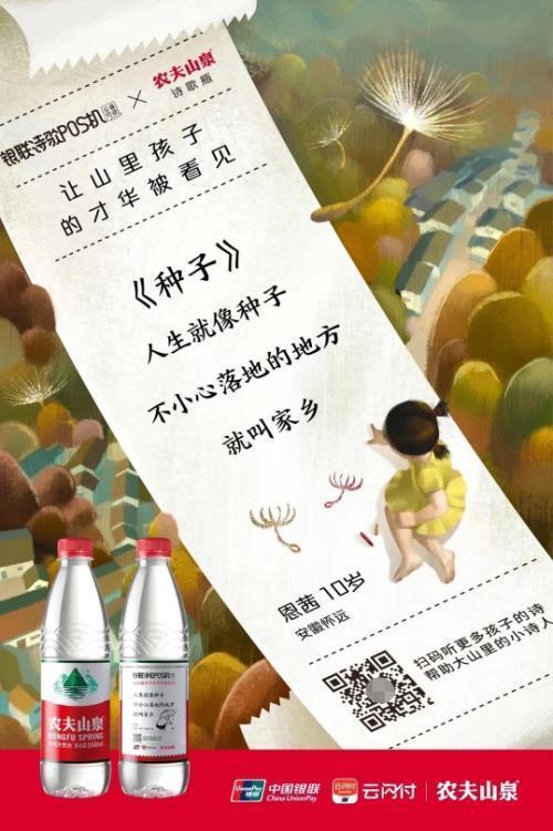 在本次公益行动中,银联还与农夫山泉合作,在逾亿瓶农夫山泉天然水的瓶身上印制了山里孩子的诗歌,将山区儿童的才华通过银联诗歌POS机“诗歌瓶”展示给更广大的人群。