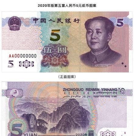 中国人民银行定于2020年11月5日起发行2020年版第五套人民币5元纸币。2020年版第五套人民币5元纸币保持2005年版第五套人民币5元纸币规格、主图案、主色调、“中国人民银行”行名、国徽、盲文面额标记、汉语拼音行名、民族文字等要素不变,优化了票面结构层次与效果,提升了整体防伪性能。2020年版第五套人民币5元纸币发行后,与同面额流通人民币等值流通。