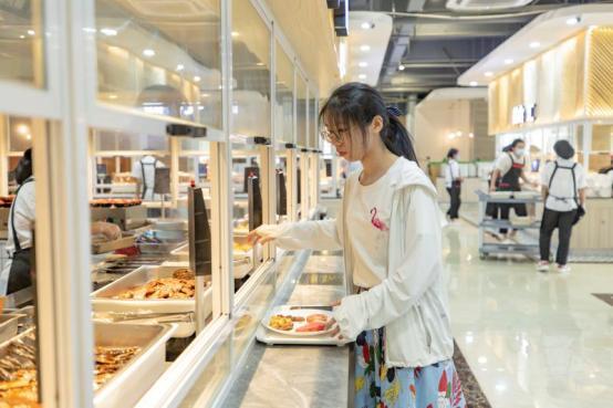 学生正在为餐盘添加食物,拿多少立马无感支付结算,智慧餐厅很智慧