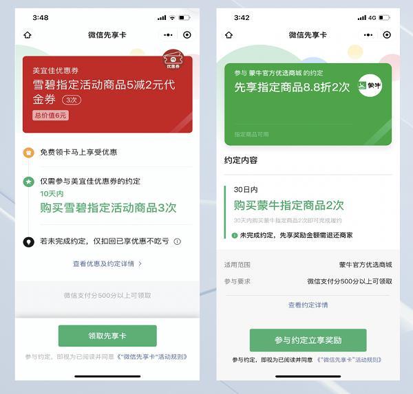 在2020年的微信公开课PRO上,先享卡首次亮相,先享卡的产品逻辑是,用户先享受优惠,但是如果没有达到商家的指标,享受的优惠会被代扣返还回商家。本质上,这是一款商家营销工具,该产品包含4个特色,分别是玩法可自由配置(比如完成何种指标)、到期前可提醒用户、可代扣未履约优惠、引入社交元素。