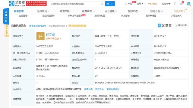 企查查APP显示,上海东方汇融信息技术服务有限公司成立于2011年,2012年,东方汇融获得中国人民银行颁发的《支付业务许可证》。公司法定代表人为任义彪,注册资本为1亿人民币,全资大股东为上海东方汇融文化商务有限公司。后者9月24日发生工商变更,原股东均退出,新增成都携程旅行社有限公司为唯一股东。