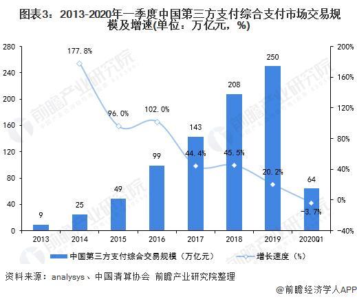2020年一季度,由于疫情影响,线下消费类交易规模大幅减少,第三方支付综合支付市场交易规模仅为64万亿元,同比下降3.7%。