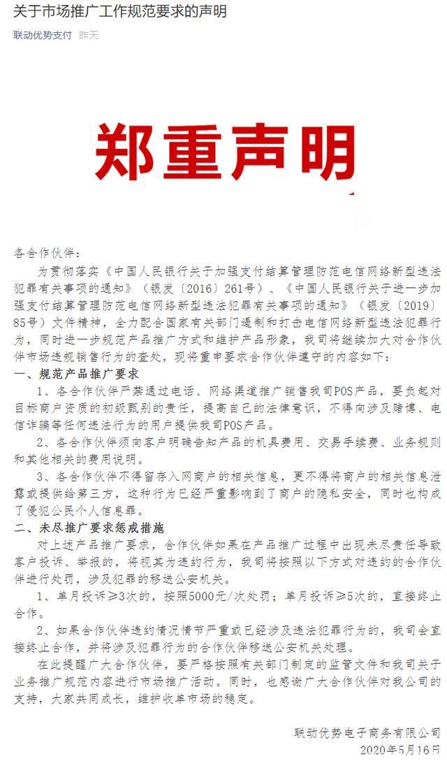 电销,网销,短信营销POS机的不法行为又开始愈演愈烈,更有甚者利用电销POS诈骗用户钱财,实在是行业内的一大毒瘤,但却难以根除。针对此种情况多家支付公司紧急发布声明,提醒用户切勿贪图便宜上单受骗!多家支付公司发布声明,严禁电销