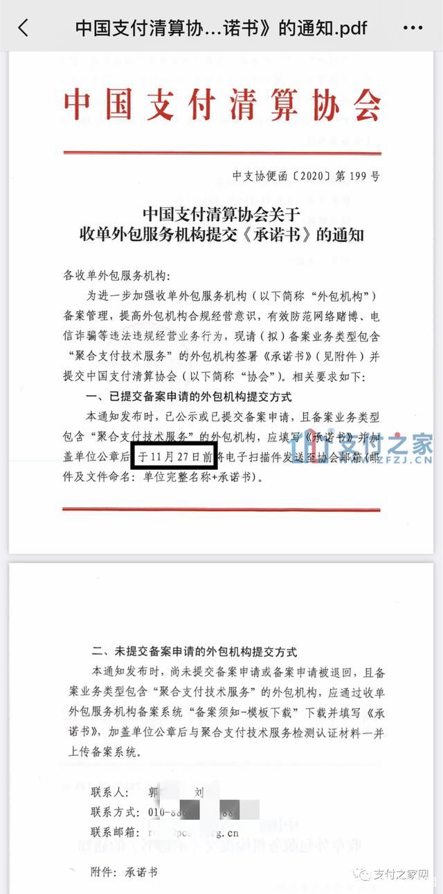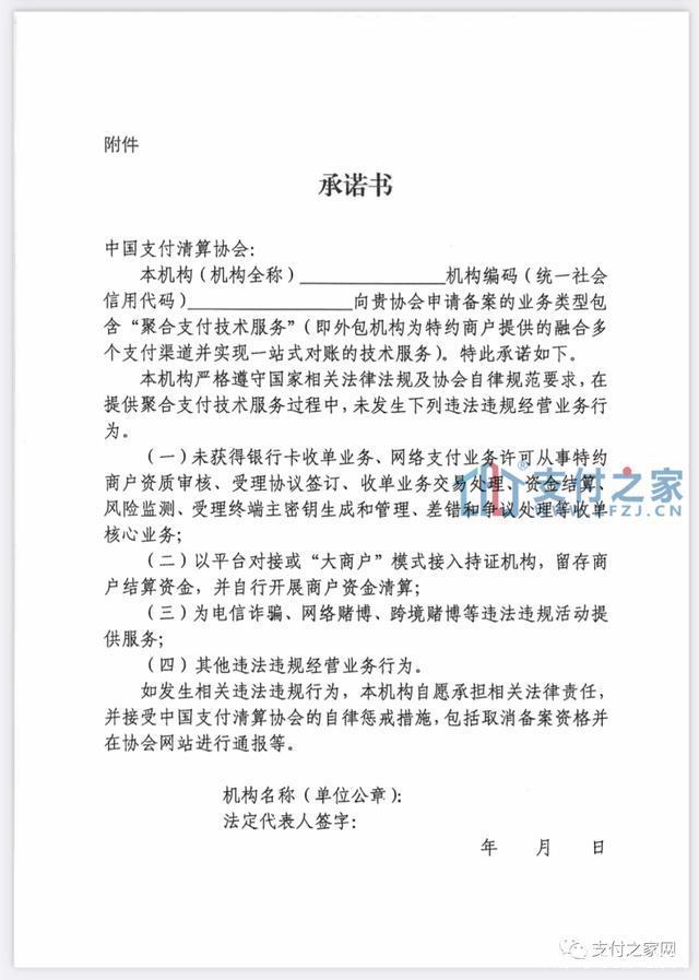通知要求,备案业务类型包含“聚合支付技术服务”的已提交申请或已备案的外包机构签署《承诺书》并于11月27日前提交中国支付清算协会。