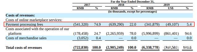 有趣的是,拼多多2019年的交易额超过1万亿,是2017年1412亿的5倍多,但2017年的支付成本反而只有2019年的63%,原因是收到了支付服务费的返点。