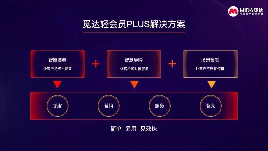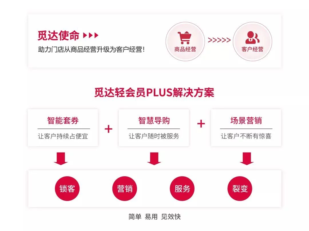 针对目前实体门店面临的五大客户经营难题,觅达打造了以“券“为核心的轻会员PLUS协同运营体系,简称轻会员体系。通过三大系统协同实现赋能实体门店,帮助门店实现拉新锁客、提升复购、增强粘性和分享裂变等。