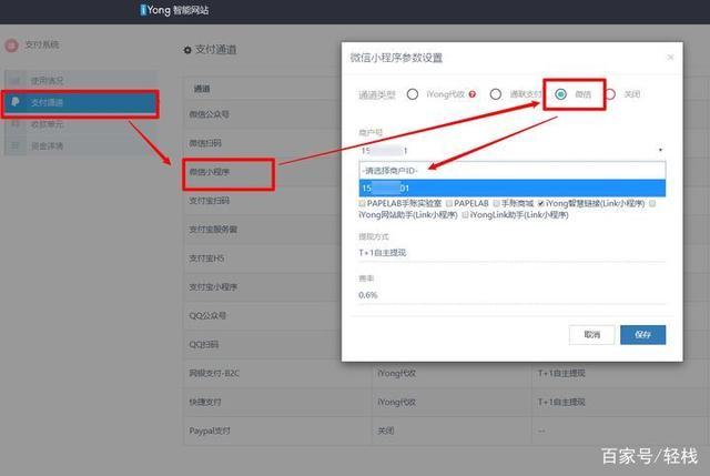 设置微信小程序支付通道的时候,选择签约商户号id,用户付款直达商家商户号,费率遵循官方规则,比如T+1自助提现, 费率0.6%