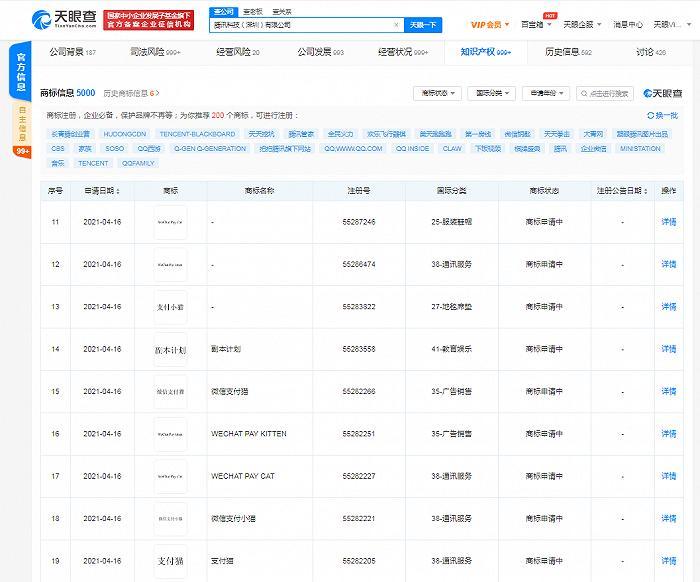 据天眼查APP显示,近日,腾讯科技(深圳)有限公司申请“支付猫”“微信支付猫”“WECHAT PAY CAT”“WECHAT PAY KITTEN”等图文系列商标,国际分类涉及金融物管、广告销售、通讯服务、科学仪器等,商标状态均为“商标申请中”。