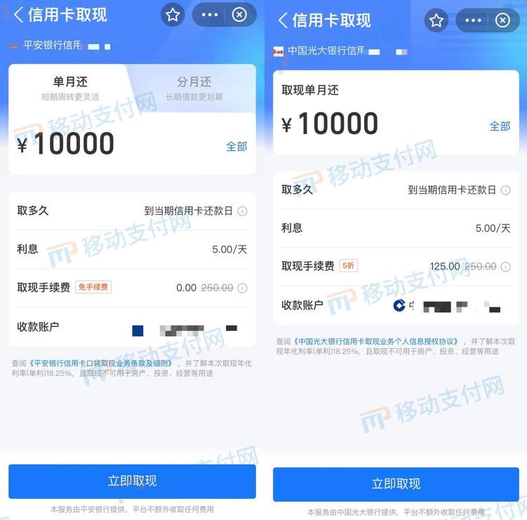 分别以平安银行和光大银行为例,取现10000元均需要5元/天的利息,折合年化利率(单利)为18.25%。取现手续费方面,光大银行目前是5折优惠,需要125元,平安银行则全免。用户点击“立即取现”后便会接收到银行动态验证码,验证完毕现金将进入用户指定的储蓄账户。