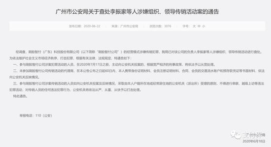 6月22日广州市公安局发布关于查处李振家等人涉嫌组织、领导传销活动案的通告,通告称经调查,刷脸智付(广东)科技股份有限公司(以下简称“刷脸智付公司”)的经营模式涉嫌传销犯罪,我局已对该公司的负责人李振家等人涉嫌组织、领导传销活动进行查处。为依法维护社会主义市场经济秩序,打击犯罪,根据有关法律、法规规定,特通告如下: