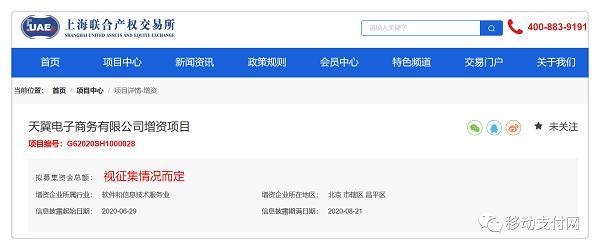 在此之前,翼支付的首次增资项目于2019年1月31日在上海联合产权交易所成交,成交价为9.45284607亿元。彼时翼支付目标是,新增不超过(包括)5名投资人,增资完成后投资人持股比例合计不超过49%,中国电信股份有限公司持股比例不低于51%。