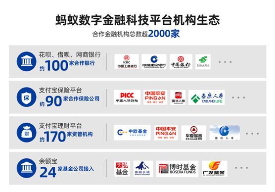如今,与蚂蚁合作的金融机构超过2000家,其中约100多家合作银行、约90家保险公司、约170家资管机构等。