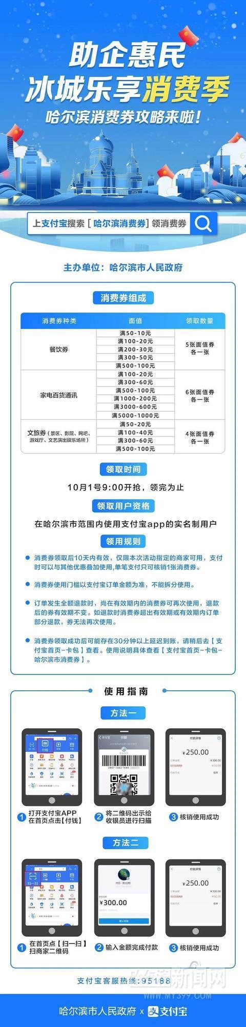 记者从哈尔滨市商务局获悉,为扩大政府消费券覆盖范围,将阿里(支付宝)纳入消费券发放渠道,10月1日9时记得来支付宝领券!