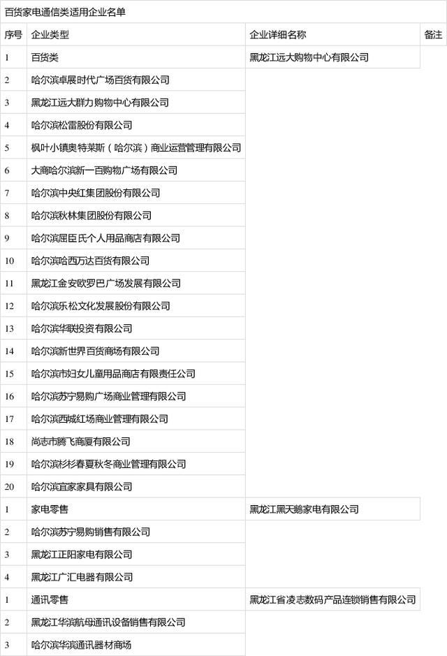 (一)百货家电通讯类(不含超市):适用于远大、卓展、松雷、枫叶小镇、新一百、中央红、秋林、屈臣氏、哈西万达、金安国际、乐松、华联、新世界、苏宁易购、西城红场、杉杉奥莱、宜家、哈尔滨妇女儿童用品商店、尚志市腾飞商厦等20家大型百货公司,黑天鹅家电、苏宁易购、正阳家电、广汇电器4家家电商场及凌志数码、黑龙江华滨通讯设备和哈尔滨华滨通讯器材3家商场。